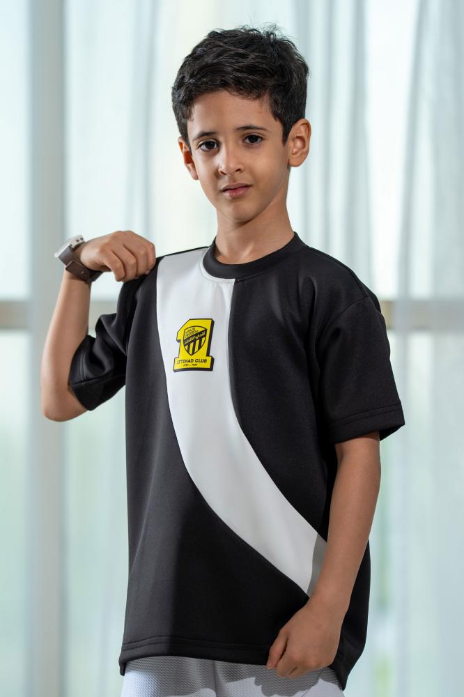 تيشيرت نادي الإتحاد يتميز بتصميم أنيق وعصري يعكس روح الفريق العريق والانتماء الرياضي بكل فخر. يأتي بلون أسود مع شريط أبيض طويل على الصدر يحمل شعار النادي بطباعة واضحة وأنيقة.