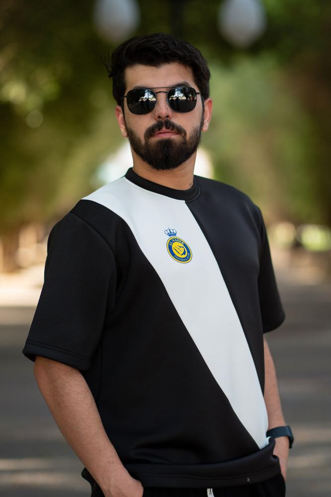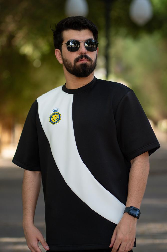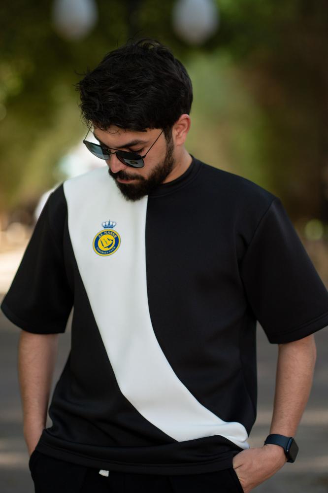 تيشيرت نادي النصر يتميز بتصميم أنيق وعصري يعكس روح الفريق العريق والانتماء الرياضي بكل فخر. يأتي بلون أسود مع شريط أبيض طويل على الصدر يحمل شعار النادي بطباعة واضحة وأنيقة.