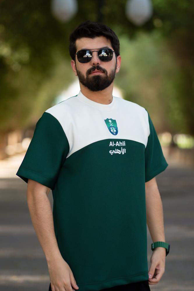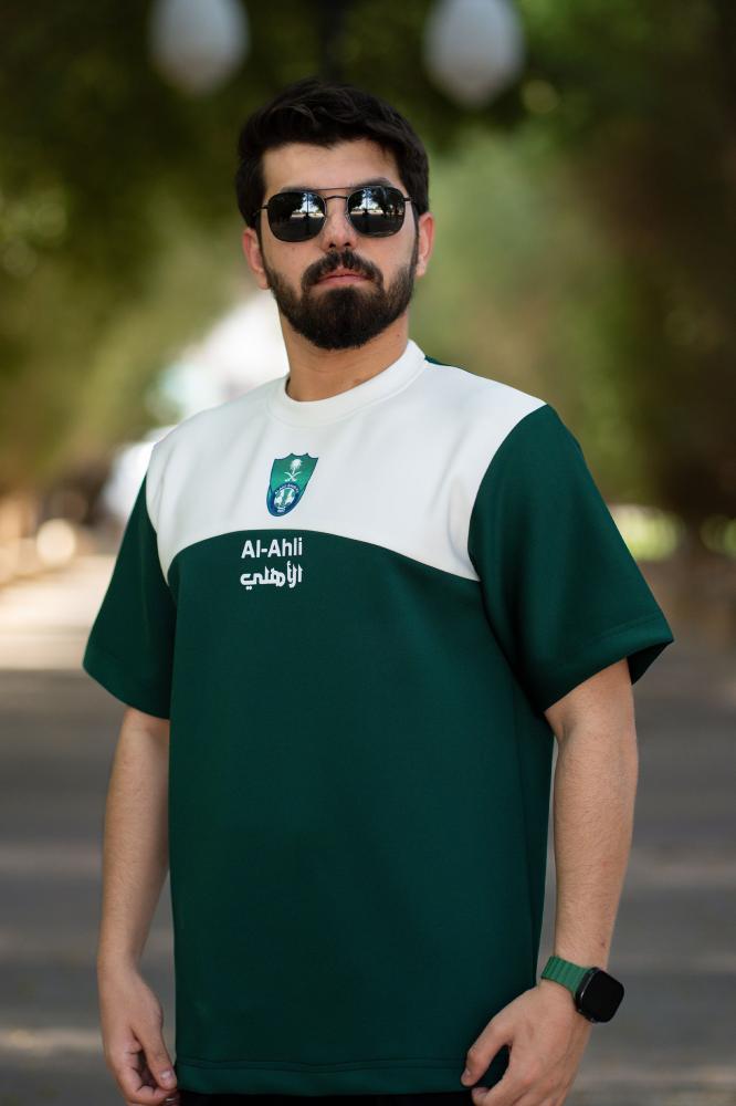 تيشيرت نادي الأهلي يتميز بتصميم أنيق وعصري يعكس روح الفريق العريق والانتماء الرياضي بكل فخر. يأتي بلون أخضر جذاب بإنحناء مائل أبيض على الصدر يحمل شعار النادي ” بطباعة واضحة وأنيقة.