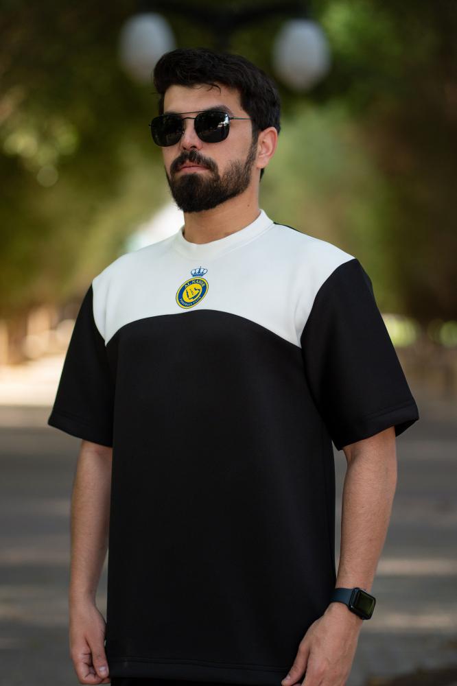 تيشيرت نادي النصر يتميز بتصميم أنيق وعصري يعكس روح الفريق العريق والانتماء الرياضي بكل فخر. يأتي بلون أسود بإنحناء مائل أبيض على الصدر يحمل شعار النادي ” بطباعة واضحة وأنيقة.