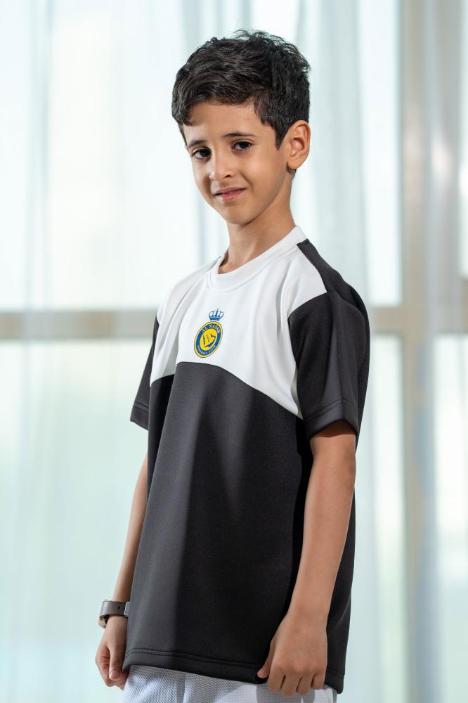 تيشيرت نادي النصر يتميز بتصميم أنيق وعصري يعكس روح الفريق العريق والانتماء الرياضي بكل فخر. يأتي بلون أسود بإنحناء مائل أبيض على الصدر يحمل شعار النادي ” بطباعة واضحة وأنيقة.