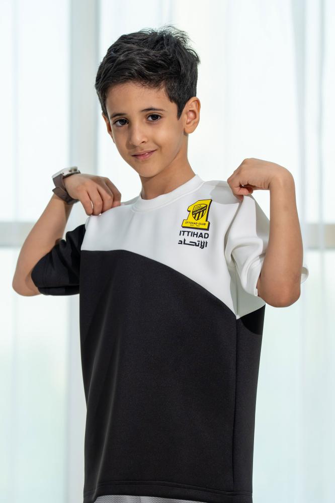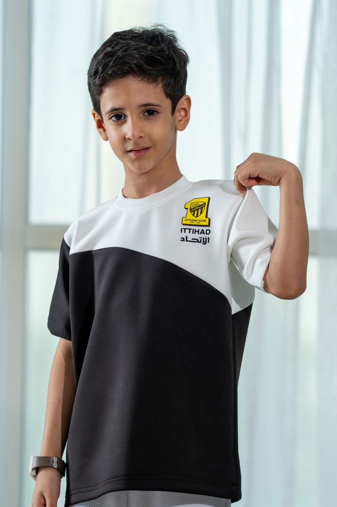 تيشيرت نادي الإتحاد يتميز بتصميم أنيق وعصري يعكس روح الفريق العريق والانتماء الرياضي بكل فخر. يأتي بلون أسود بإنحناء مائل أبيض على الصدر يحمل شعار النادي وكلمة “ITTIHAD – الإتحاد ” بطباعة واضحة وأنيقة.