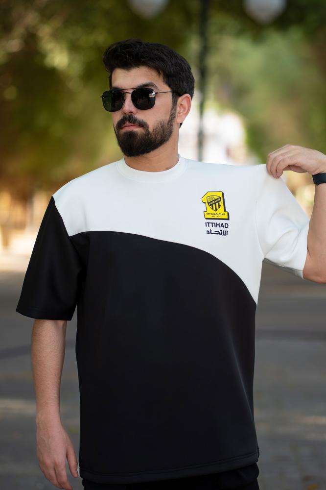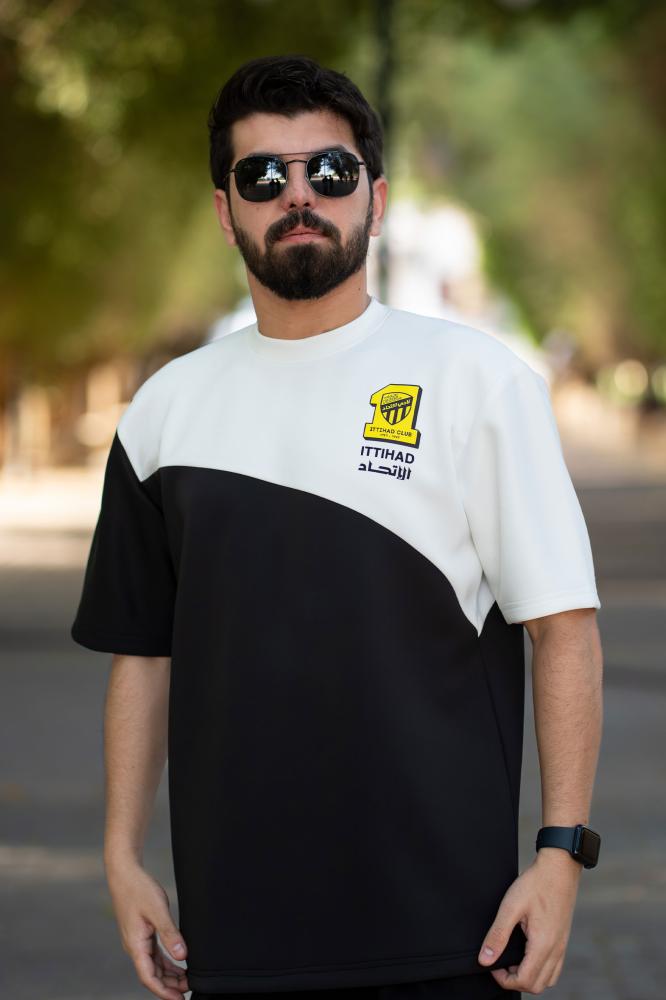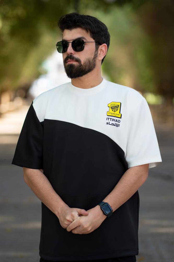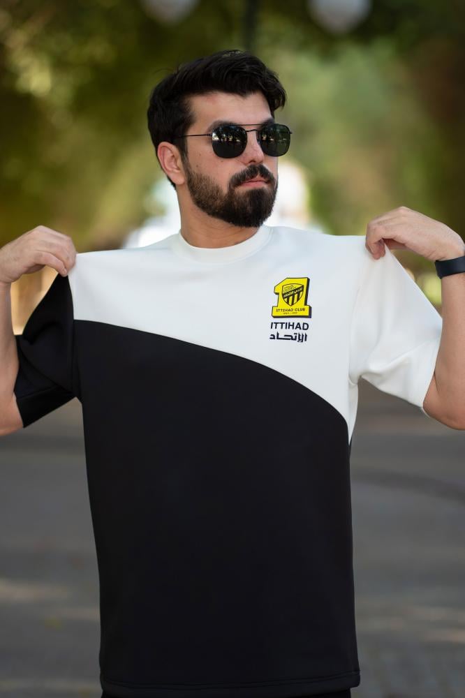 تيشيرت نادي الإتحاد يتميز بتصميم أنيق وعصري يعكس روح الفريق العريق والانتماء الرياضي بكل فخر. يأتي بلون أسود بإنحناء مائل أبيض على الصدر يحمل شعار النادي وكلمة “ITTIHAD – الإتحاد ” بطباعة واضحة وأنيقة.